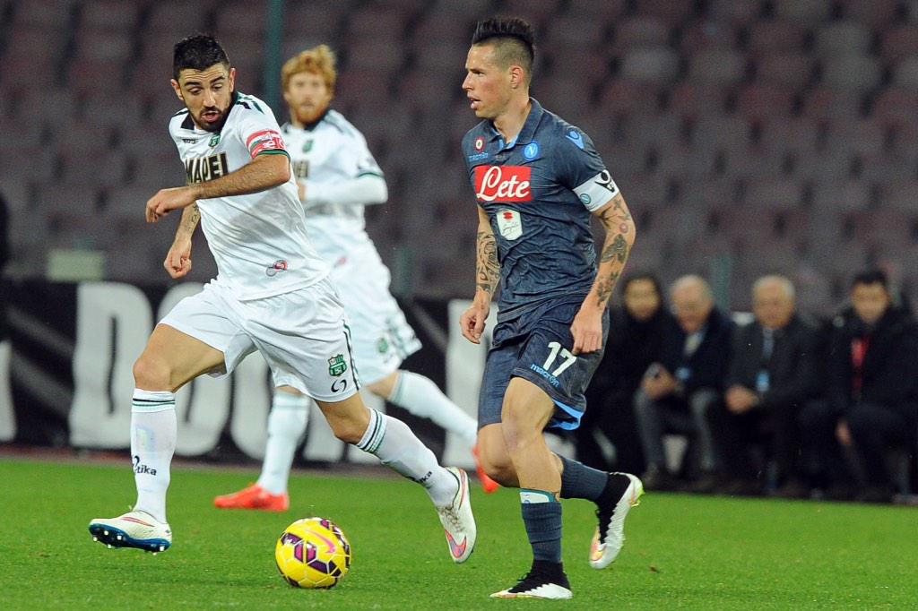 Η απουσία του τιμωρημένου Higuain έφερε τον Zapata στην βασική ενδεκάδα, με τον Κολομβιανό να δίνει την λύση για τους Παρτενοπέι ανοίγοντας το σκορ στο 61' απέναντι στην Σασσουόλο που κρατούσε μέχρι τότε το 0 παρά την πίεση των γηπεδούχων. Το δεύτερο γκολ ήρθε στο 70' από τον Hamsik με σουτ, αφού ο Zapata αρχικά προστάτευσε και εν συνεχεία του έστρωσε την μπάλα. Δύο λεπτά αργότερα η αυστηρή απευθείας κόκκινη στον Mertens, ο οποίος είχε μόλις πέντε λεπτά στον αγωνιστικό χώρο, άφησε την Νάπολι με 10 παίχτες, με τον Anduhar να κρατάει το 0 στο 77' σε σουτ του Manianelli. Tο σκορ δεν άλλαξε μέχρι την λήξη και με αυτή την νίκη η Νάπολι πλησίασε στους τρεις πόντους την Ρόμα και ταυτόχρονα διεύρυνε την διαφορά της από της ομάδες που ακολουθούν.